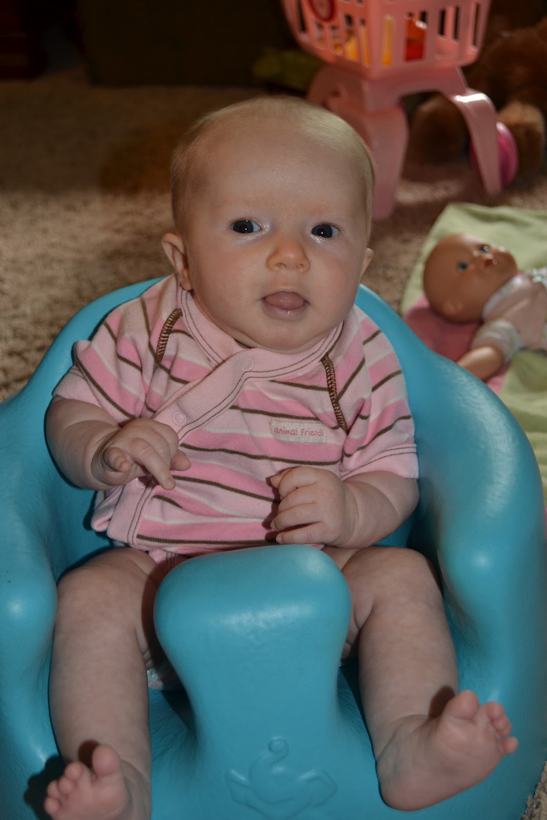Isabelle in the bumbo! She is doing so good sitting. She can't last very long, but I'm so amazed that at 2ish months this little baby is strong enough to hold her head up enough to sit in the bumbo.